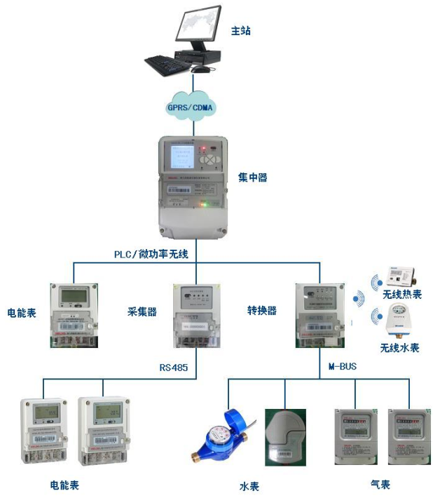 系統(tǒng)主要由主站系統(tǒng)、集中器、接口(通信協(xié)議)轉(zhuǎn)換器、基本的計(jì)量?jī)x表單元(電能表、水表、氣表和暖表)等構(gòu)成。