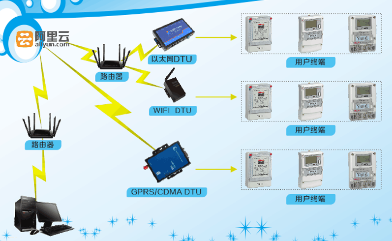 在廣域網(wǎng)、局域網(wǎng)中通過以太網(wǎng)和WIFI的通訊方式實(shí)現(xiàn)電能表、數(shù)傳終端、系統(tǒng)之間數(shù)據(jù)傳輸,但GPRS/CDMA通訊方式必須在廣域網(wǎng)的條件下實(shí)現(xiàn)通訊功能。