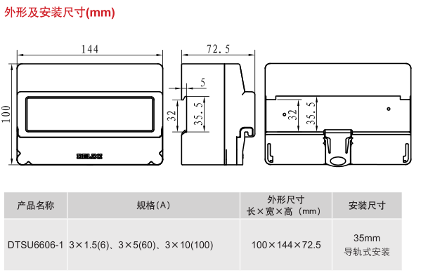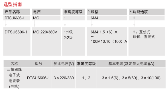 訂貨示例:如客戶需要互感式的DTSU6606-1三相四線電子式電能表(導軌), 電壓為220/380V,準確度等級為1,電流規(guī)格為1.5(6)A, 則相對應的訂貨編碼為:DTSU66061MQ16M4H。