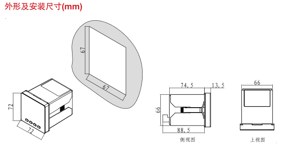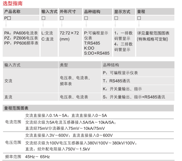 例 1 、如客戶需要單相交流電流表,產(chǎn)品名稱為電流表,輸入方式為交流,外形尺寸為 72 × 72, 品