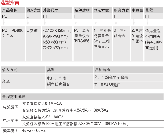 為 42 × 42, 品種結(jié)構(gòu)為可編顯示儀表,顯示方式為液晶顯示,量程為 AC450V 100/5A 則相對(duì)應(yīng)的
