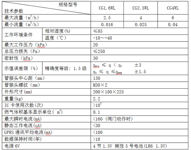 CG1.6WL/CG2.5WL/CG4WL 無(wú)線遠(yuǎn)傳膜式燃?xì)獗硎且阅な饺細(xì)獗頌橛?jì)量基表,加裝流量信號(hào)采集模塊、GPRS無(wú)線傳輸模塊、IC卡模塊、閥門(mén)控制模塊及電源管理模塊等所組成的新型智能燃?xì)獗?。該表除具有煤氣、天然氣、液化石油氣等燃?xì)獾捏w積計(jì)量功能外,還具有計(jì)量數(shù)據(jù)機(jī)電轉(zhuǎn)換、無(wú)線數(shù)據(jù)傳輸、閥門(mén)遙控等功能。技術(shù)指標(biāo)符合GB/T 6968 《膜式燃?xì)獗怼?,JJG 577 《膜式燃?xì)獗怼贰?br />
