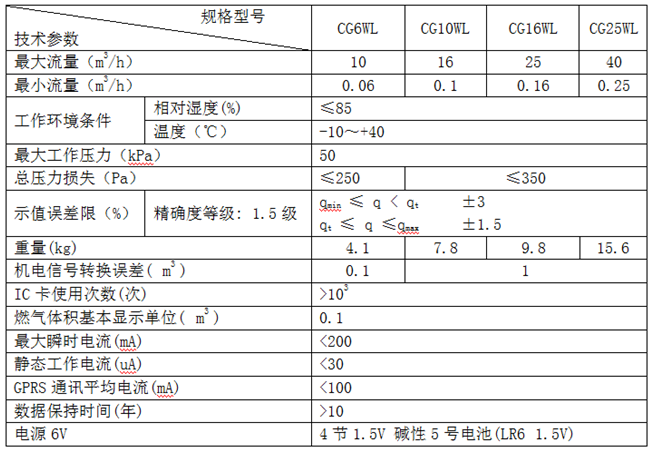 CG6WL/CG10WL/CG16WL/CG25WL 無(wú)線遠(yuǎn)傳膜式燃?xì)獗硎且阅な饺細(xì)獗頌橛?jì)量基表,加裝流量信號(hào)采集模塊、GPRS無(wú)線傳輸模塊、IC卡模塊、閥門(mén)控制模塊及電源管理模塊等所組成的新型智能燃?xì)獗?。該表除具有煤氣、天然氣、液化石油氣等燃?xì)獾捏w積計(jì)量功能外,還具有計(jì)量數(shù)據(jù)機(jī)電轉(zhuǎn)換、無(wú)線數(shù)據(jù)傳輸、閥門(mén)遙控等功能。技術(shù)指標(biāo)符合GB/T 6968 《膜式燃?xì)獗怼?,JJG 577 《膜式燃?xì)獗怼贰?br />